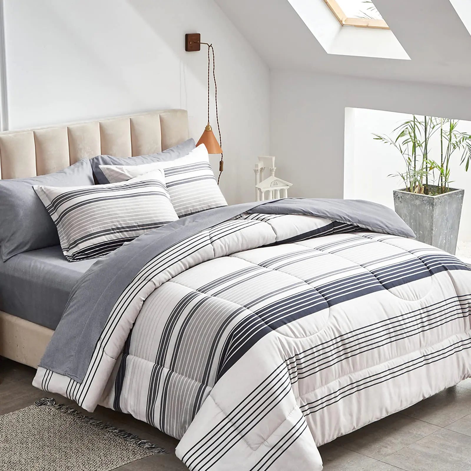 [Material - Made of 100% skin-friendly and no electric static Microfiber ultra soft and comfortable to offer you a good sleep :) Set - 7 Piece California King Size Bed in a Bag Includes - 1 CA King size comforter 102”x94” 1 King Fitted Sheet 78" W x 80" L + 12" 1 King Flat Sheet 102" W x 105" L 2 pillow shams 20”x36” 2 King Pillowcases 20" W x 40" L The fitted sheet is 14 inch Pocket. Fits mattresses up to 14". Pattern - unadorned gray navy (look like black) stripes elegant boho style update your room look. Perfect choice for holiday and festival. Machine Washable - Machine wash in cold water gentle cycle tumble dry on low or dry naturally do not bleach. Customer Service - Welcome to Flysheep if you are not satisfied with us feel free to contact us at amazon we are here to help you asap :)]