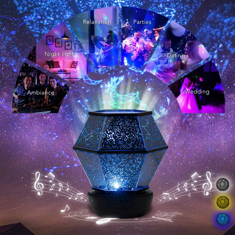 Crafted from durable materials, the Star Projector features a sleek design and offers 3-step dimming to create the perfect atmosphere for relaxation or sleep. You can choose between multiple color options, with both 3-color and 5-color emissions available, ensuring a dynamic experience every night.